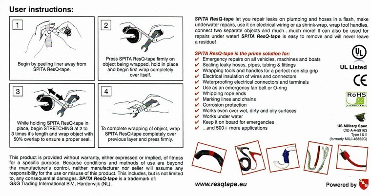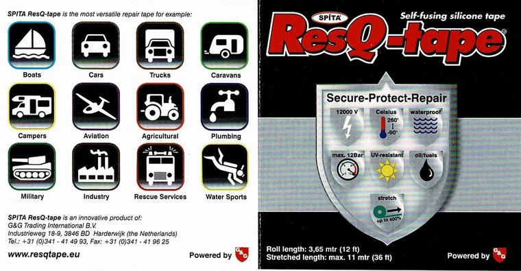 ResQ-tape kan gebruikt worden om twee voorwerpen met elkaar te verbinden, of om lekkages af te dichten. Het fuseert razendsnel tot een water- en luchtdichte afdichting. U kunt er ook lekkages in slangen onder water mee repareren! ResQ-tape kan altijd eenvoudig verwijderd worden en laat geen lijmresten achter.